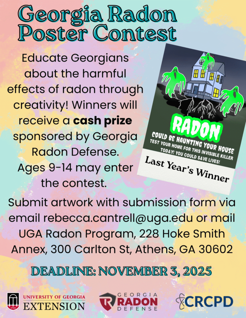 All posters must be submitted to Rebecca Cantrell by November 3, 2025. Posters may be submitted by email (rebecca.cantrell@uga.edu) or mail (UGA Radon Program, 228 Hoke Smith Annex, Athens, GA 30602). Posters must include an artwork submission form and follow the guidelines below to be considered. 1st, 2nd, and 3rd place winners in Georgia will receive a cash prize donated by Georgia Radon Defense.